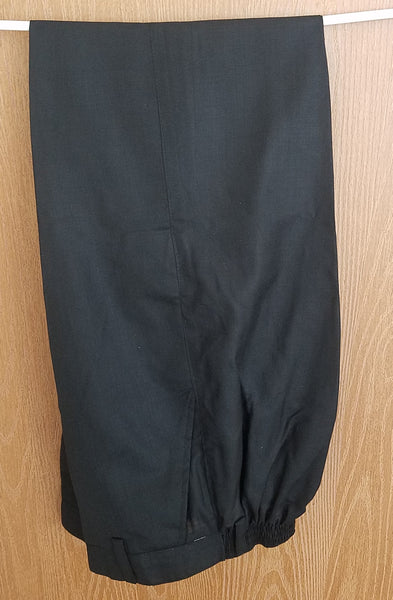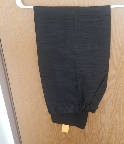 Black S36 #4581609 Black Tussore, Kurta Shoulder 15”, Chest 39”, Length 37” long Sleeves. Pants Elastic Waist 28” Length 38”