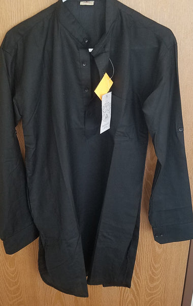 Black M38 #4581613 Black Tussore, Kurta Shoulder 16,” Chest 41”, Length 38” long Sleeves. Pants Elastic Waist 34” Length 38”