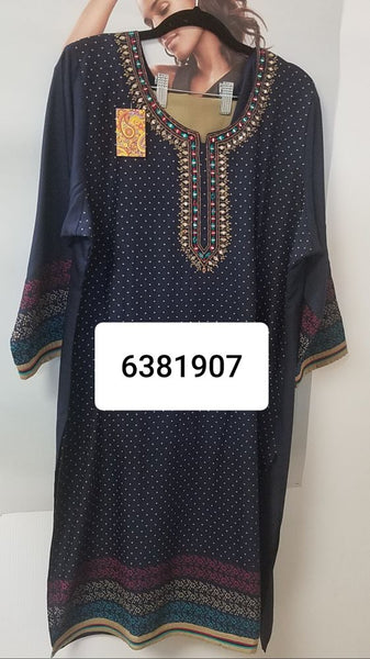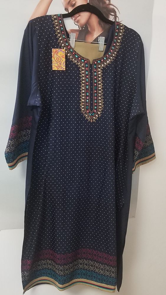 The Kameez is a navy-blue rayon with a beige print, mirror, multi-color thread detail, and a long-sleeved shirt. The Kameez size is good for bust 49-50”, shoulder 17.5”, waist 48”, hips 52, and length 39”. The salwar is khaki beige rayon, and the dupatta is navy-blue Georgette beige, multi-color printed.